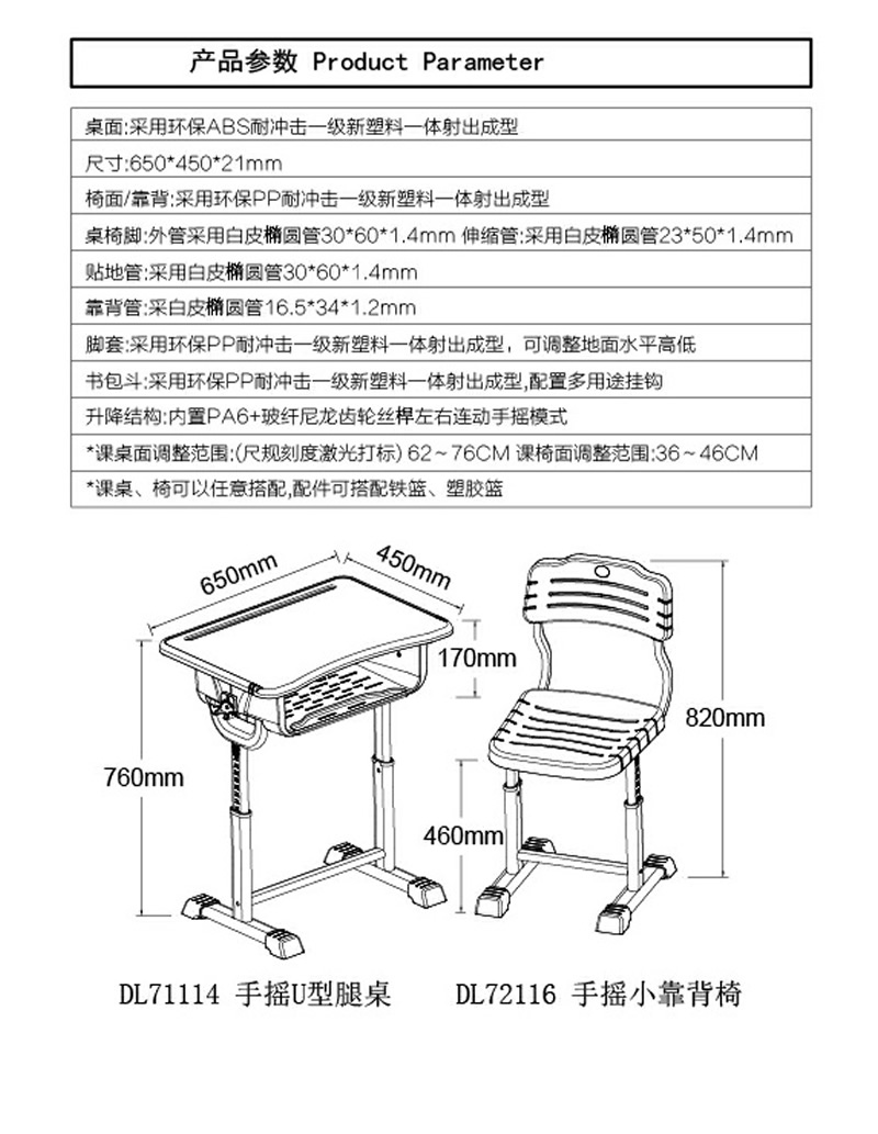 <div> <br /> <div> DL71114手搖U型腿桌</div> <div> DL72116手搖小靠背椅</div> <div> 桌子:760*650*450mm</div> <div> 椅子:460*400*820mm</div> <div> </div> </div> </div> <br /> ," />