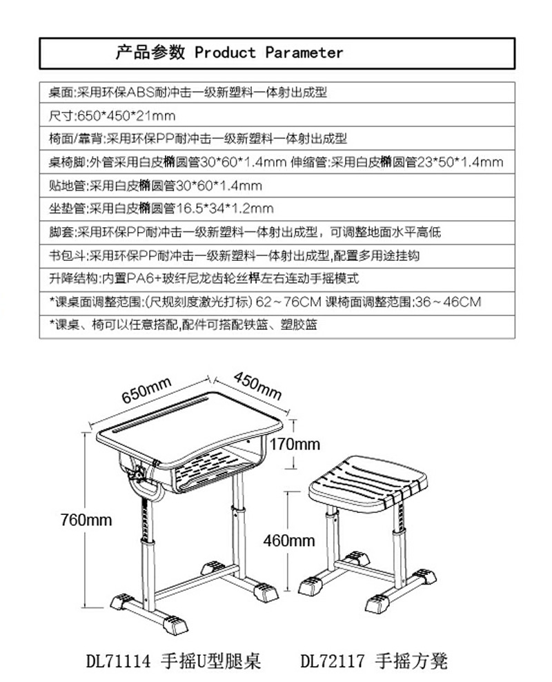 <div> <div> <br /> <div> DL71114手搖U型腿桌</div> <div> DL72117手搖方凳</div> <div> 桌子:760*650*450mm</div> <div> 椅子:460*400mm</div> <div> <br /> <br /> </div> </div> </div> </div> <br /> ," />